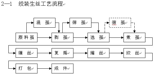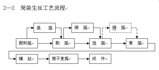為便于儲存保管,桑蠶鮮繭需經(jīng)過殺蛹、達到一定干燥程度的烘干處理,將鮮繭處理為含潮率在13%左右的干繭,再進入工廠倉庫儲存?zhèn)溆。這里僅介紹白廠絲的工藝流程。按白廠絲包裝形式的不同,制絲工藝流程如下圖示:
