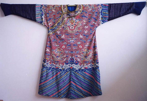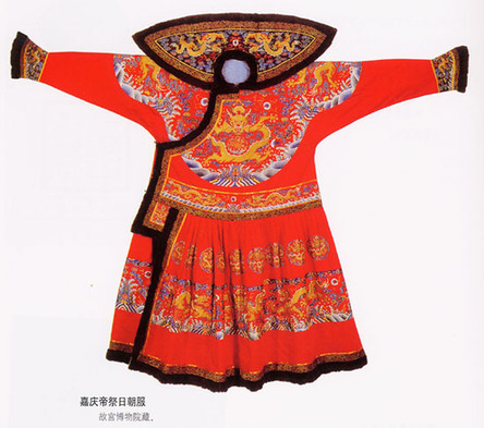 皇后的冠服,同樣有禮服、吉服之分;屎蟮某垡彩敲鼽S色的,披領(lǐng)及袖為石青色,前后胸及領(lǐng)、袖各有一條金龍,間以五色云朵,下為海水紋。有的中間有疊褶,腰帷四條行龍,下幅為八條行龍,前后各一條正龍,兩肩行龍各一條,比皇帝的朝袍上出現(xiàn)的龍要少很多。除朝袍外,還有朝裙。朝裙有疊褶,上為紅色織金壽字緞,下為石青行龍妝緞,夏裙則以透氣涼爽的紗為裙料;屎蟮亩Y服中還有一種叫朝褂,形狀似長(zhǎng)坎肩,穿在朝袍外。石青地,片金邊兒,前后繡有兩條立龍,下分四層花紋,金龍周圍襯以萬(wàn)福、萬(wàn)壽紋樣。吉服稍簡(jiǎn)單些,但仍用華貴的織繡物來(lái)裝飾。