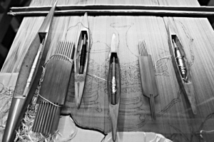 緙絲的織造工具類似織錦,為古老木機(jī)及若干竹制梭與撥;然而與織錦不同的是,緙絲所采用的是“通經(jīng)斷緯”式織造技藝,用同色蠶絲貫通作經(jīng),用各色彩絲作緯,根據(jù)紋樣的輪廓或色彩的變化采用不斷換梭和局部回緯的方式織制圖案。緙絲無關(guān)印染,不需底布,手法繁復(fù)。