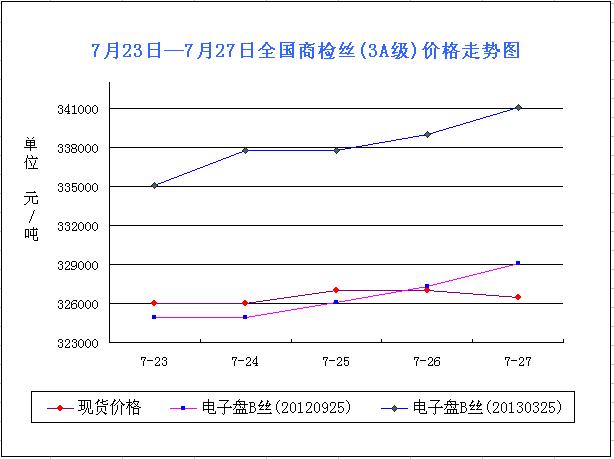 從圖表可以看出,本周現(xiàn)貨市場(chǎng)變化不大,基本都在32.6萬(wàn)/噸偏右徘徊,整體價(jià)格位和上周幾乎沒(méi)有差別,唯一變化的而就是本周市場(chǎng)交易再現(xiàn)冷清,大概是經(jīng)過(guò)幾周的漲價(jià)之后,市場(chǎng)開(kāi)始平靜,甚至開(kāi)始回調(diào)。本周價(jià)格:國(guó)內(nèi)3A級(jí)商檢絲現(xiàn)貨均價(jià)周初326000元/噸左右,隨后價(jià)格小漲,周末均價(jià)在326500元/噸左右,整體漲500元/噸。綜合現(xiàn)在的價(jià)格來(lái)看,繭絲市場(chǎng)行情到現(xiàn)在這個(gè)價(jià)位已經(jīng)不錯(cuò),不論對(duì)于下游綢廠服裝廠等,價(jià)格成本上壓力也沒(méi)那么大了,如果價(jià)格能一直這樣平穩(wěn),那么繭絲綢業(yè)將會(huì)朝向更好的方向發(fā)展;對(duì)于上游來(lái)講,絲廠的利益和絲價(jià)繭價(jià)緊密相關(guān),而繭子的價(jià)格又和蠶農(nóng)的收入相連,因此來(lái)講,本年來(lái),干繭收購(gòu)價(jià)格整體不差,對(duì)蠶農(nóng)來(lái)說(shuō),收入中規(guī)中矩。另外產(chǎn)量,隨著春繭,夏繭的逐步結(jié)束,市場(chǎng)歸于一方面的平靜也在清理之中,因此近期繭絲市場(chǎng)可謂平靜不少,漲價(jià)主要原因則受絲綢消費(fèi)季的影響,炎熱夏季,正是絲綢產(chǎn)品的熱銷(xiāo)季節(jié),很多人都會(huì)在這個(gè)季節(jié)選擇絲綢服飾以及絲綢家居服等,另外絲綢家紡床品也開(kāi)始熱銷(xiāo)。而外圍消息上看,歐美市場(chǎng)依舊如此,唯一值得慶幸的是人民幣對(duì)美元匯率有所緩解,此點(diǎn)對(duì)于以出口為主的繭絲綢業(yè)來(lái)講利處不小。